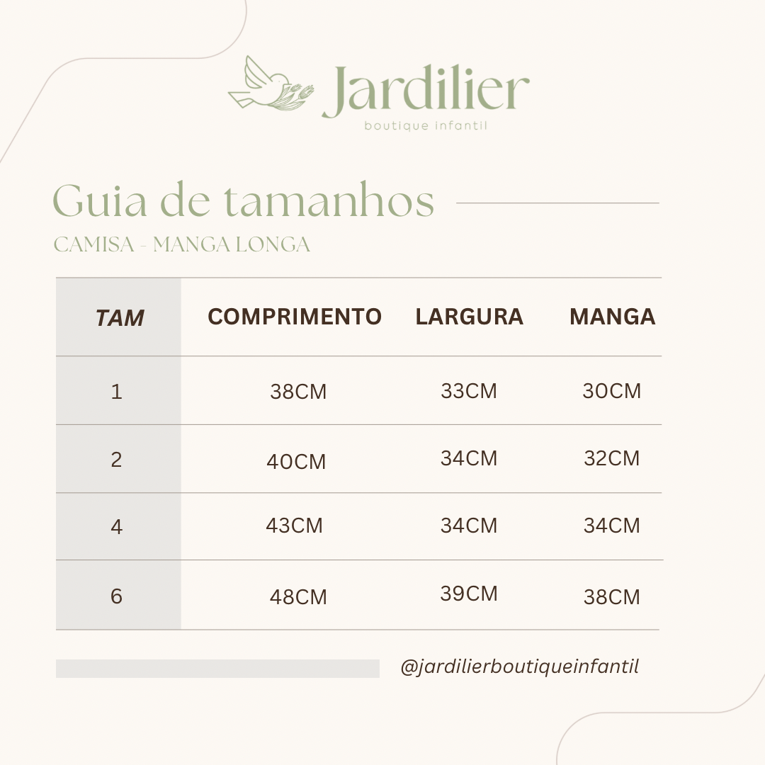 Camisa infantil em tricoline, confeccionada em tecido leve, macio e de toque suave, proporcionando conforto durante todo o dia. Possui modelagem clássica com gola tradicional, mangas longas com punhos e fechamento frontal por botões. O detalhe bordado no peito acrescenta um toque sutil de charme e sofisticação, perfeita para ocasiões especiais ou para compor looks casuais com elegância.