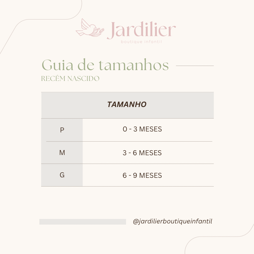 Composto por macacão e manta em tricot na cor rosê, com mangas longas e pezinho, garantindo conforto e aconchego para o bebê. Possui gola redonda em renda, delicadamente adornada com bordados manuais e aplicações de pequenas pérolas na gola e na parte central do peito, trazendo um toque de sofisticação e ternura ao modelo. A peça conta com abertura nas costas, com fechamento por botão, facilitando o vestir.