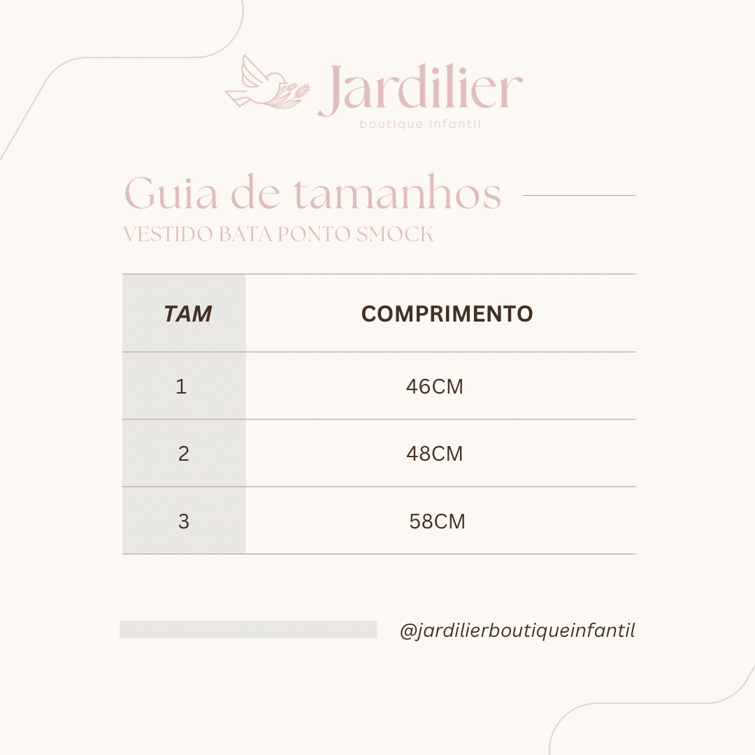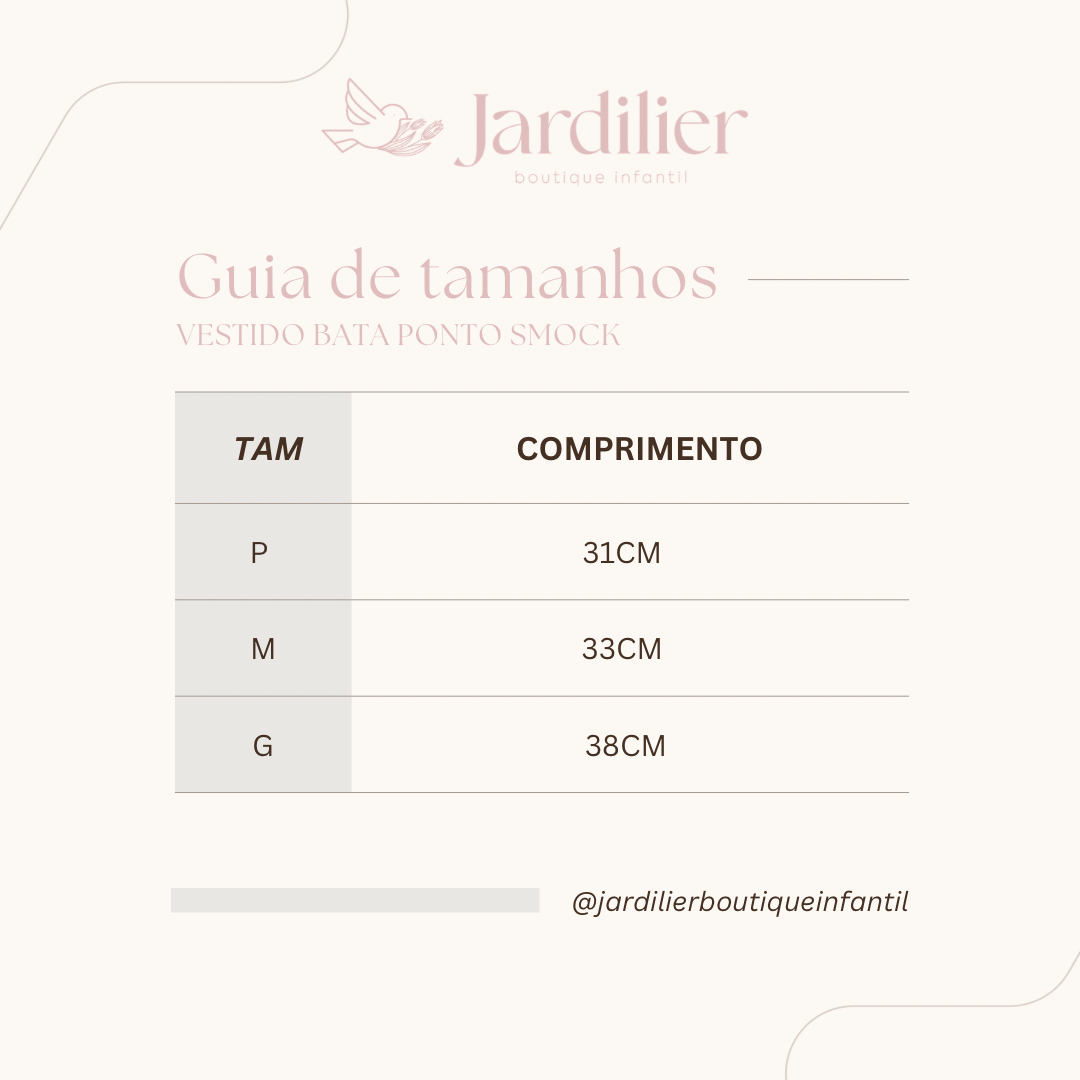 Vestido bata em algodão azul claro, com delicado bordado à mão no peito em ponto smock (casinha de abelha), formando um padrão de losangos brancos. Na base do bordado, pequenas rosas em ponto rococó com folhas verdes acrescentam um toque romântico e artesanal. O modelo possui mangas curtas com babadinhos, e a saia é solta e franzida a partir do peito, proporcionando conforto e movimento. Acompanha short calcinha combinando, completando o conjunto com charme e praticidade.